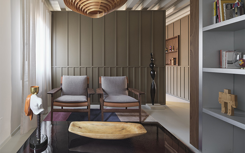 Der Innenstil spiegelt eine zeitgenössische, in der Geschichte verwurzelte Sensibilität wider: Möbel treten in Dialog zwischen Designikonen und Nichettos eigenen Stücken. In diesem Kontext fügt sich der Türgriff Viva!, den der Designer für Dnd entworfen hat, natürlich ein: Ergonomie und fließende Linien bewahren die visuelle Harmonie der Wohnung.