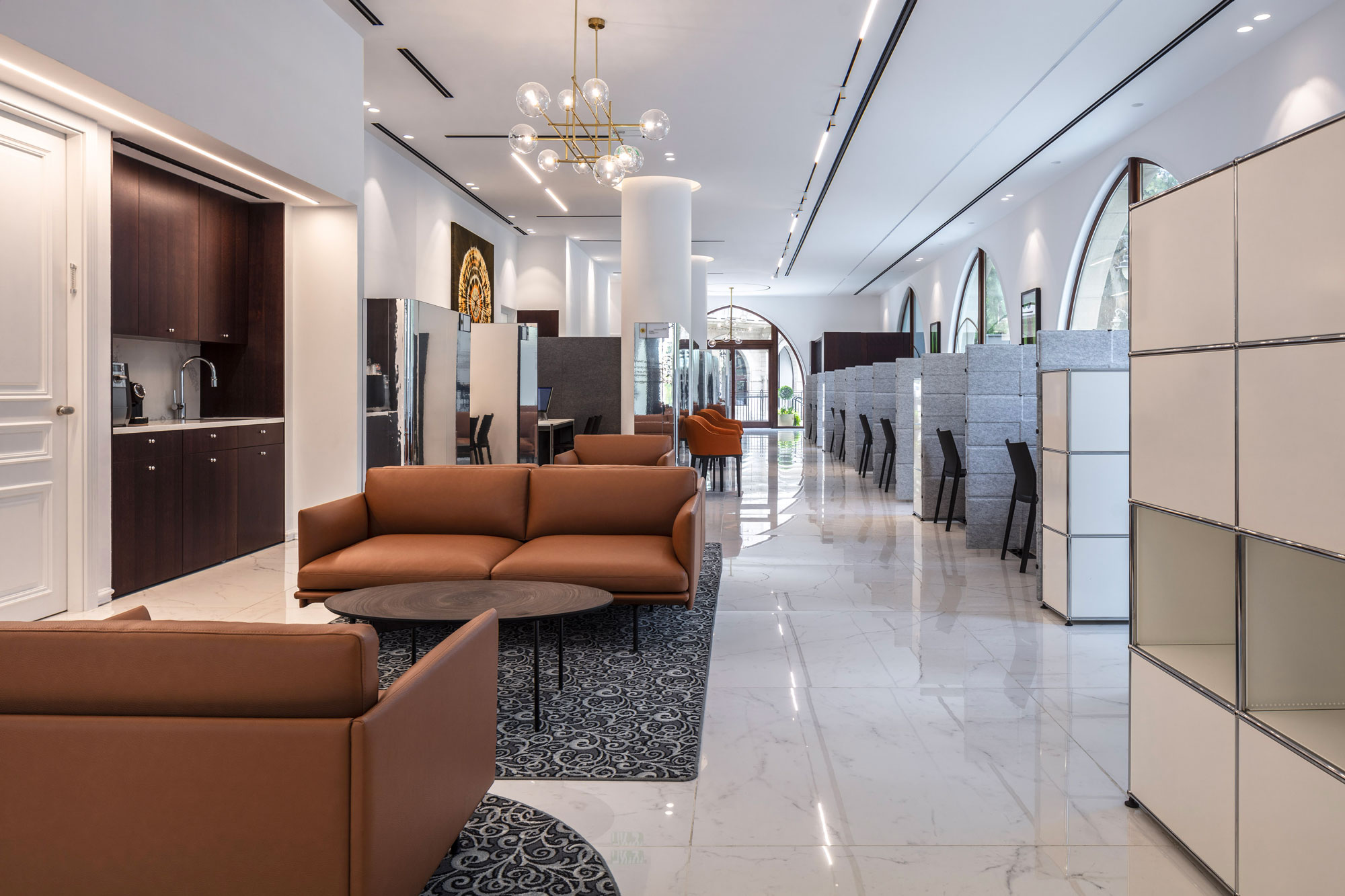 The interior of a Bank of Jerusalem branch in the renovated Waldorf-Astoria Hotel complex in Jerusalem is a space designed to welcome local and international customers.
