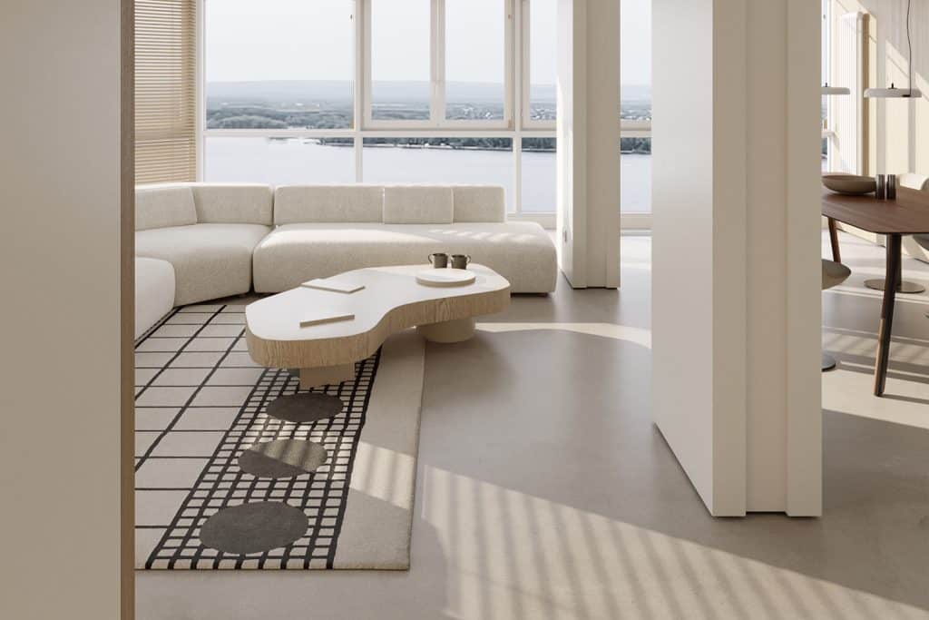El proyecto combina el minimalismo rítmico de los espacios interiores con muebles y soluciones hechas a medida, mientras que una espectacular vista panorámica abre el apartamento hacia el fascinante río Volga.