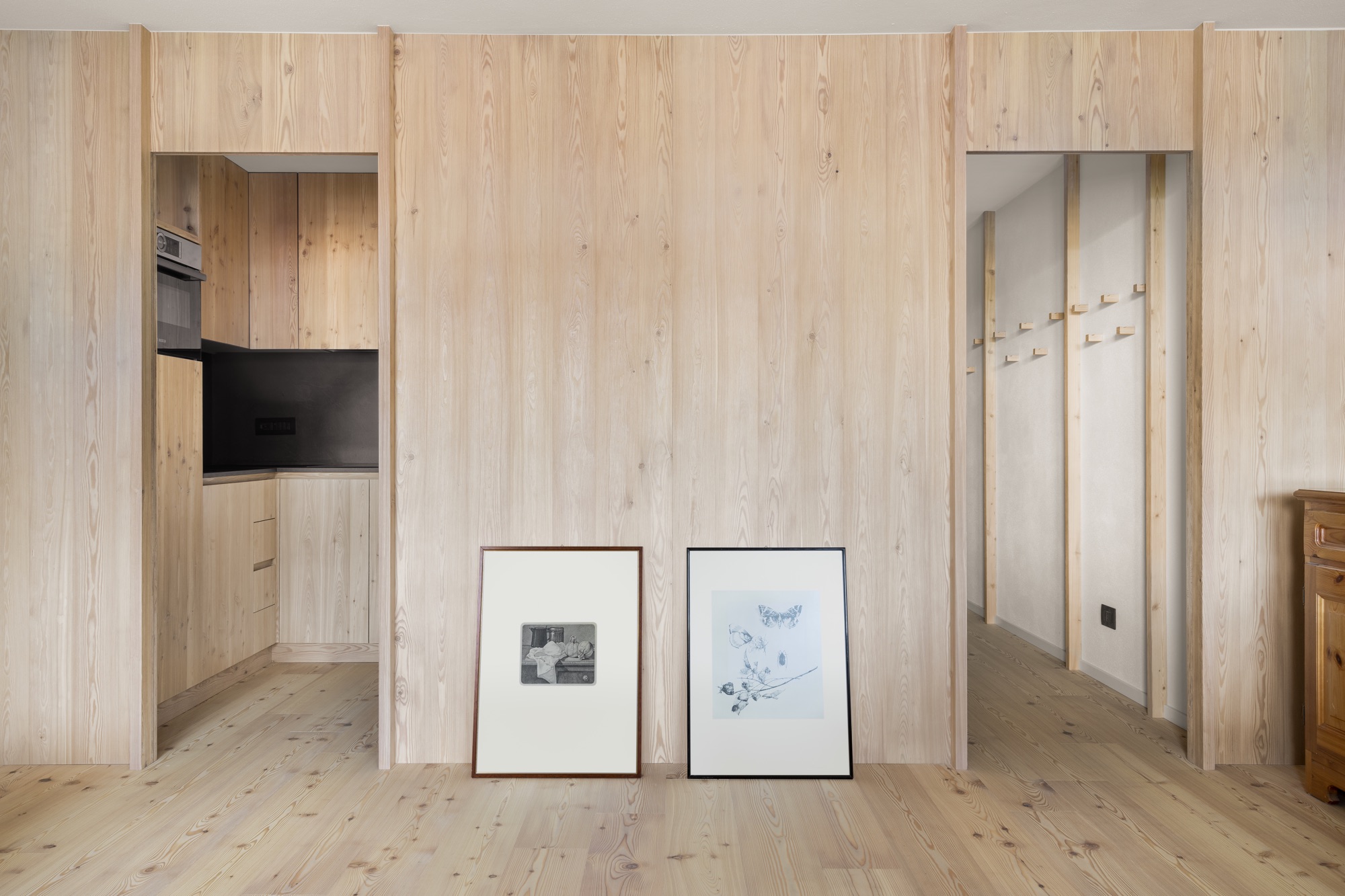La elección de los materiales naturales, tanto para los muebles a medida – diseñados por el estudio – como para el suelo, abriga el ambiente y le aporta un toque acogedor y, al mismo tiempo, elegantemente montano.