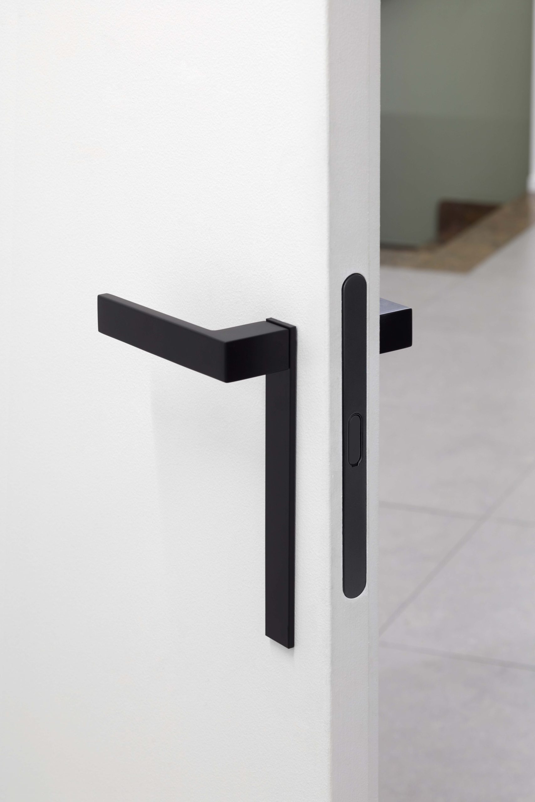 La placca riprende il profilo della maniglia, si fa sottile e si adatta orizzontalmente alla superficie della porta.