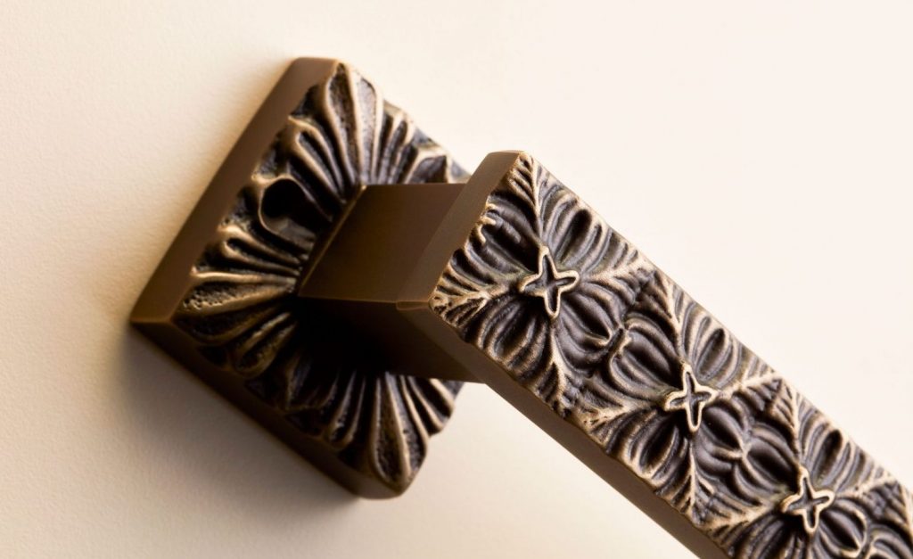 Solide et solennelle, mais aussi gracieuse et élégante : une poignée rectangulaire avec un ornement floral original.