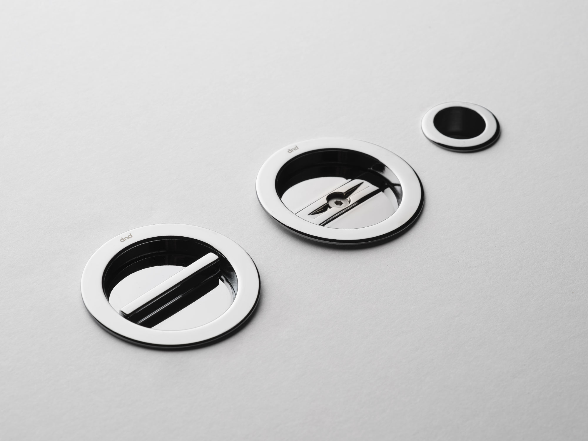 Le maniglie per porte a scomparsa completano alcune gamme del catalogo Dnd, come il modello Ginkgo che arricchisce la collezione disegnata da Giulio Iacchetti.