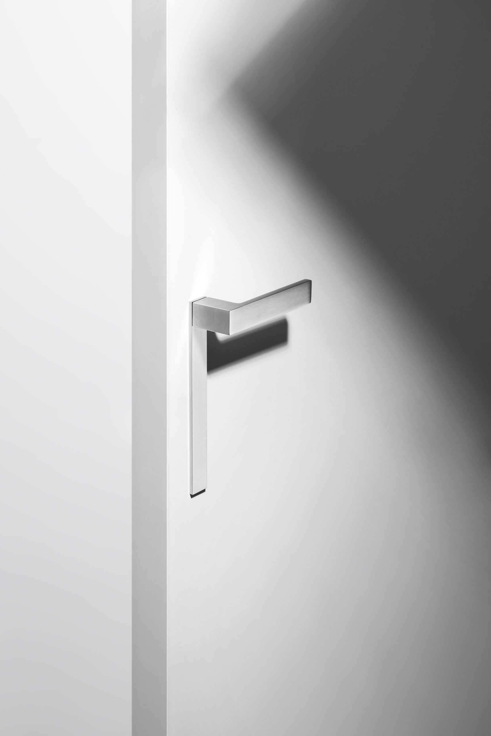 Il modello di maniglia si declina in diverse soluzioni. La rosetta diventa un elemento minimo e si innesta alla base della maniglia.