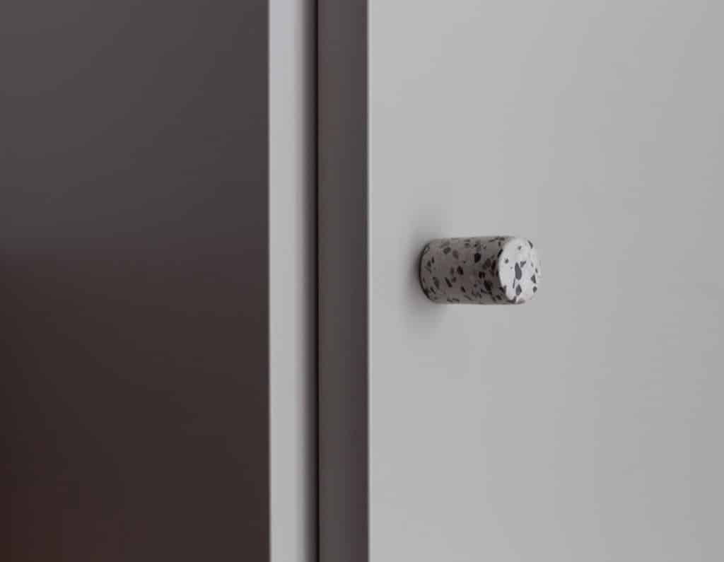 Negli interni dell’appartamento, le maniglie Zeppelin e Madeleine nella finitura nickel lucido spiccano su porte di colore verde pistacchio, bianco mandorla e tortora.