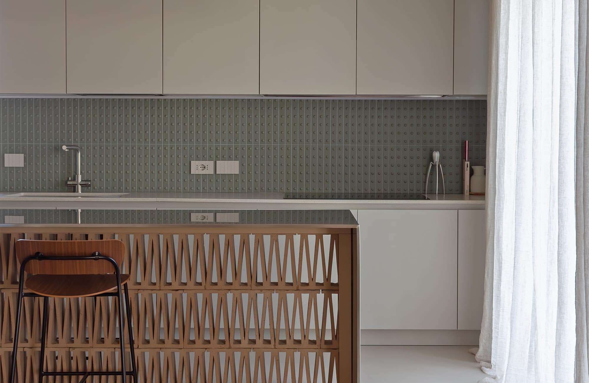 camera da letto e da un bagno, a cui si accede tramite dei pannelli scorrevoli – con vetro trasparente plissettato – che vibrano alla luce e conferiscono leggerezza. Rivestimenti ceramici d’autore, attenzioni compositive, elementi di terracotta su misura e arredi dai volumi originali sono testimoni di una grande cura per il dettaglio.