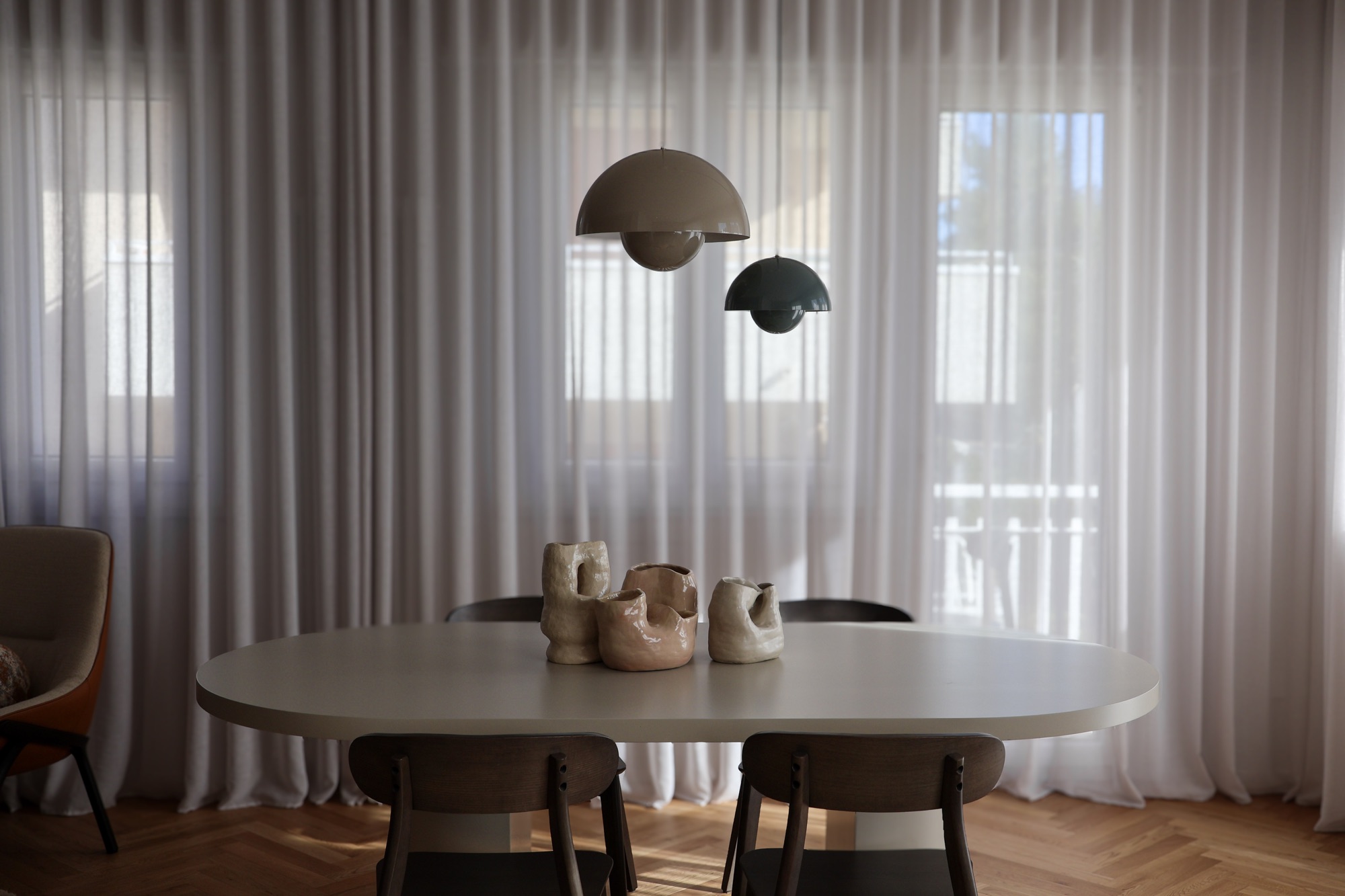 Casa MM prende forma in un elegante appartamento di Riccione, dove la scala centrale originale diventa il cuore narrativo dell’intervento. L’intero progetto si sviluppa intorno a questa presenza iconica, mantenuta e valorizzata attraverso un attento lavoro sulle finiture. L’area living è stata completamente trasformata: ambienti piccoli e chiusi lasciano spazio a un ampio open space, dove funzioni diverse convivono in un continuum fluido e luminoso.