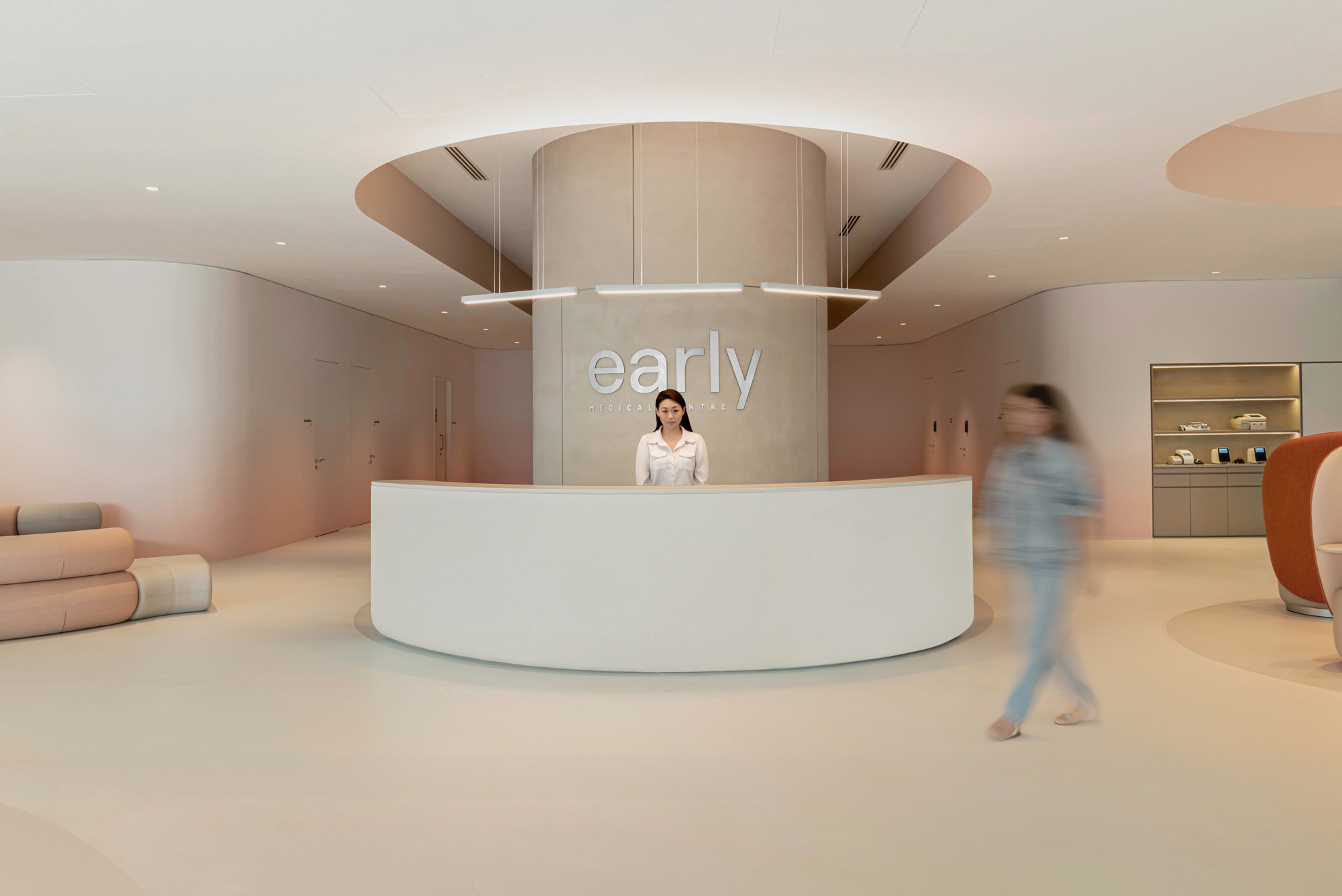 Linee curve che definiscono gli ambienti e gli arredi di un luogo di cura e prevenzione, massima apertura e trasparenza che esprimono i valori fondanti del brand. Un mood organico fatto di atmosfere avvolgenti che infondono calma e serenità, spazi fluidi e ambienti definiti da pochi elementi, da superfici continue, da linee morbide e sfumature delicate che direzionano i flussi e definiscono anche gli arredi fissi.