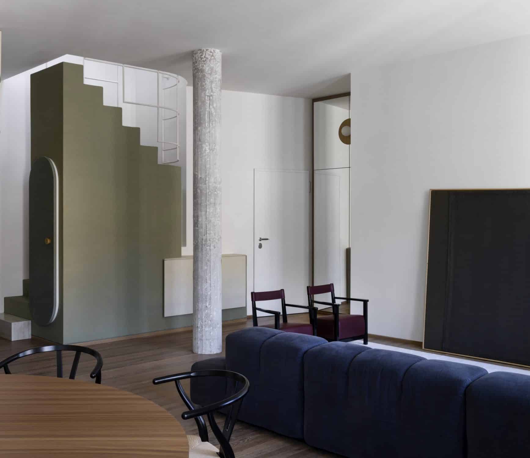 “Attico a Milano” è un progetto che nasce intorno alla volontà di collegare l’appartamento al grande terrazzo che lo sovrasta, in un signorile edificio affacciato su corte. La scala si eleva verso l’alto e la sua generosa apertura permette alla luce naturale di valorizzare lo spazio, organizzato tra volumi, colori e texture.