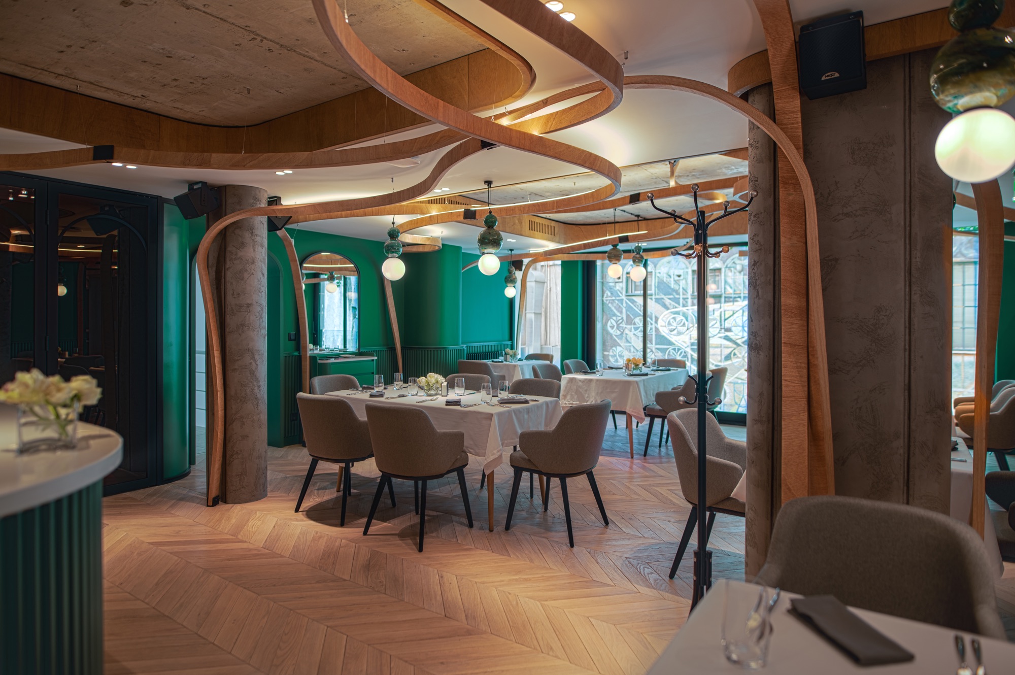 Il legno è il protagonista assoluto degli interni di questo ristorante nel cuore di Sofia. Il calore proprio del materiale naturale, le forme organiche e le traiettorie sinuose degli elementi che disegnano lo spazio e corrono sul soffitto catturano lo sguardo dialogando con le pareti verdi in un continuo rimando alle chiome degli alberi e alla morfologia delle piante.