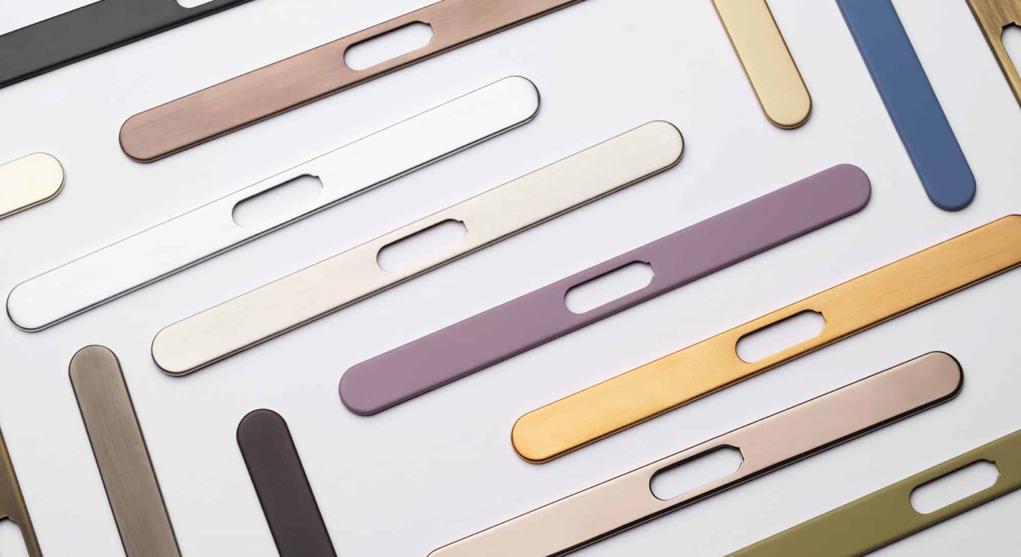Chiave e maniglia si offrono alla vista con la medesima finitura. Toni lucidi, satinati, opachi, anche con tecnologia forte® PVD, da scegliere nell’ampio catalogo Dnd.